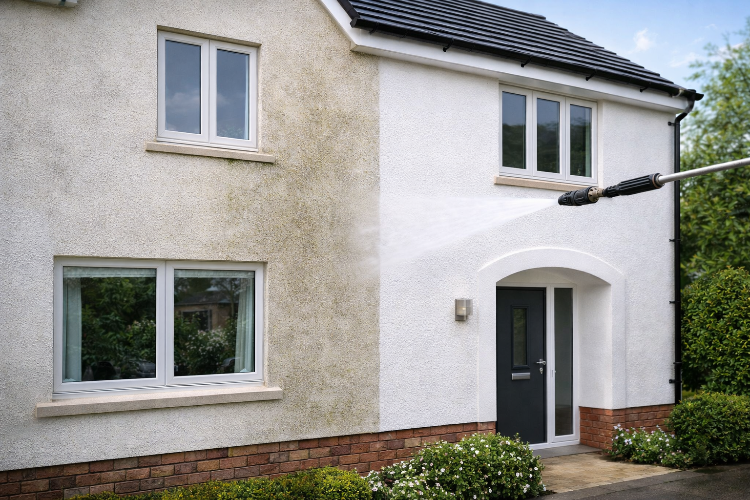 Skutecznie usuwamy lekkie i średnie zabrudzenia, glony oraz osady atmosferyczne, przywracając elewacji czysty, świeży wygląd bez uszkodzeń powierzchni. Usługa dostępna w Toruniu i okolicach.